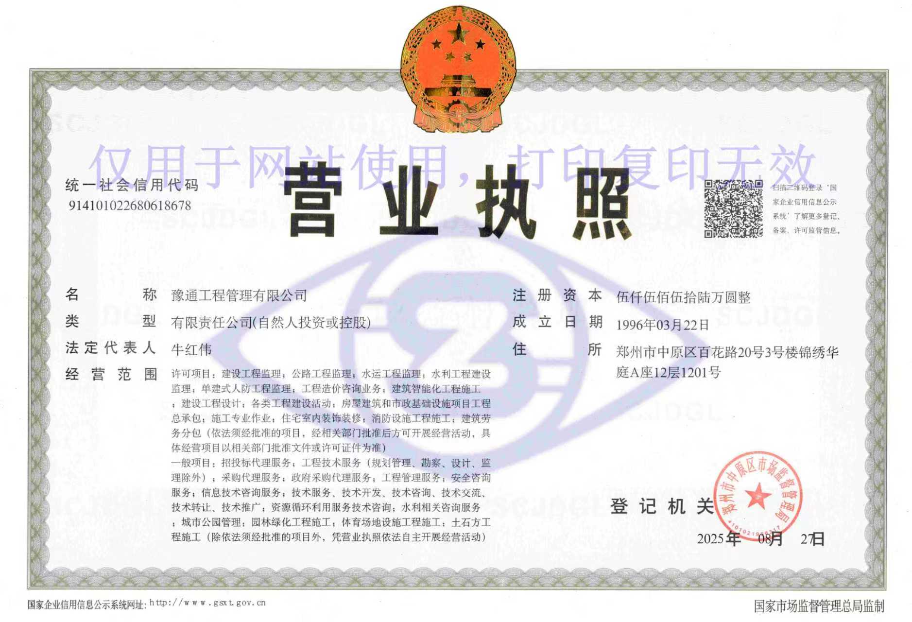 豫通工程管理有限公司(原鄭州市豫通市政公用工程監理有限公司),成立于1996年,企業可提供工程監理,工程招標代理,政府采購代理,工程造價咨詢;工程項目管理;建設工程項目咨詢服務;全過程工程咨詢服務;建筑領域內的技術開發、技術轉讓、技術咨詢及技術服務等相關服務。現擁有工程監理綜合資質,建筑裝修裝飾工程施工資質,同時開展招標代理及工程造價咨詢業務;現為中國建設監理協會會員單位,守合同重信用企業,河南省監理企業二十強(建筑業骨干企業),河南省建設監理協會副秘書長單位,河南省投標先進單位和誠實守信單位,河南工程咨詢行業十佳杰出單位,河南省住房和城鄉建設廳重點培育企業,河南省信用評價優秀等級監理企業,高新技術企業,連續多年被評為省先進監理企業和誠信建設先進企業。
