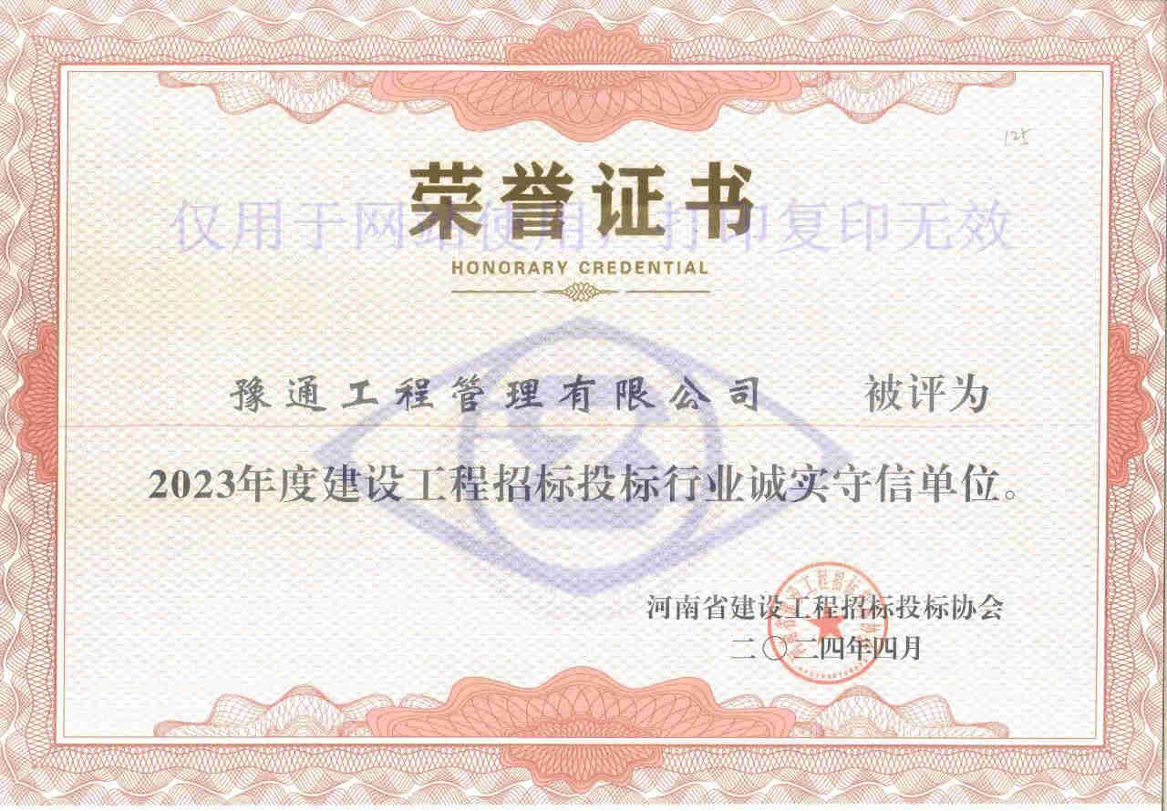 近日,河南省建設工程招標投標協會發布了《關于公布2023年度建設工程招標投標行業誠實守信單位的通知》(豫建招協字〔2024〕11號),我公司榮獲“2023年度建設工程招標投標行業誠實守信單位”榮譽稱號。