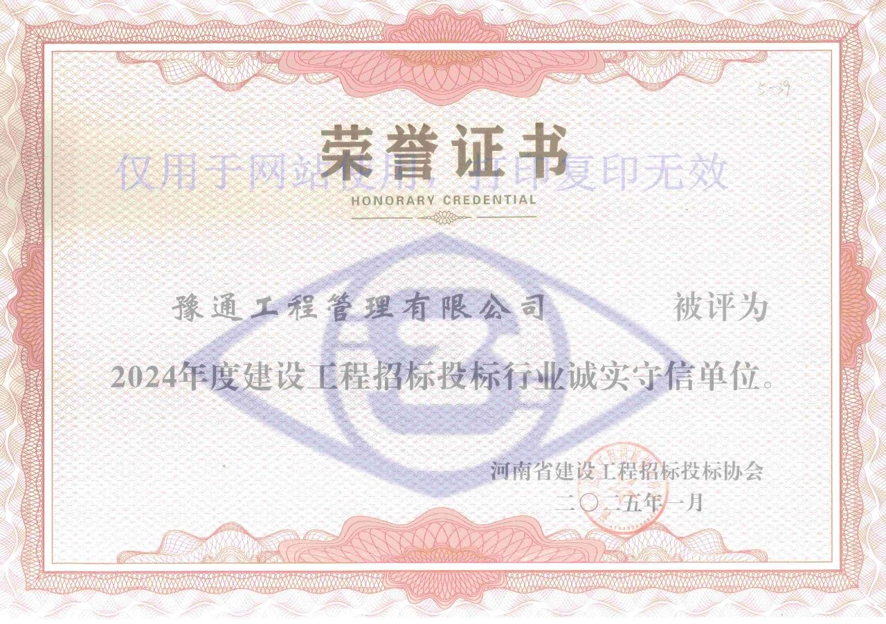 近日,河南省建設工程招標投標協會發布《關于公布2024年度建設工程招標投標行業誠實守信單位的通知》,我公司憑借良好的信譽,成功獲評“2024年度建設工程招標投標行業誠實守信單位”榮譽稱號。